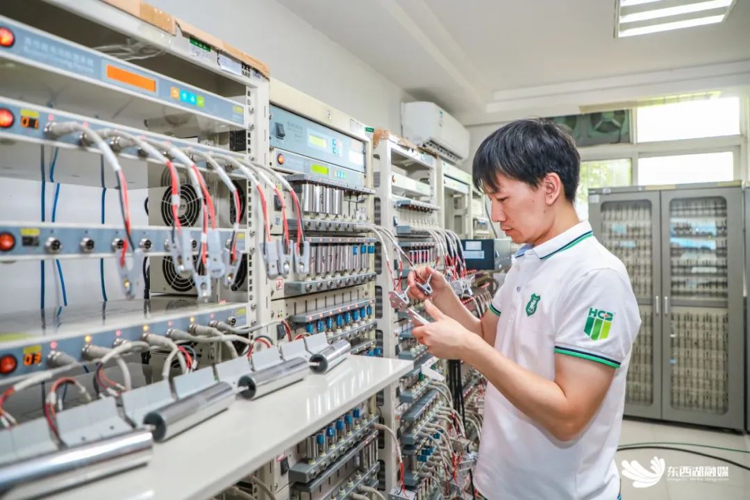 数台高性能电池检测器并排而立,信号灯不停闪烁……电性能试验室里,周敬正在测试新款电池各项指标。立项、研发、制作、实验、测试,武汉昊诚每一款锂电池的诞生,都凝结了周敬团队的汗水。