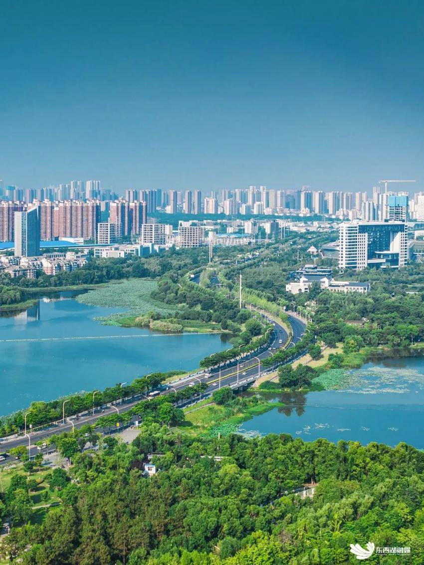 有阡陌交通的网,道路穿过湖面,从绿野仙踪闯入另一片城市秘境,一路郁郁葱葱,一片绿水青山,一城湖光山色。