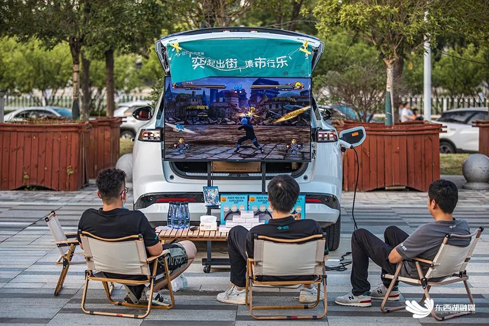 游戏厮杀在大屏幕上紧张进行,全套设备的供电来自汉产东风奕派电动车。一根牵自汽车的反向电线,让人们看到新能源车改变生活的有趣场景。