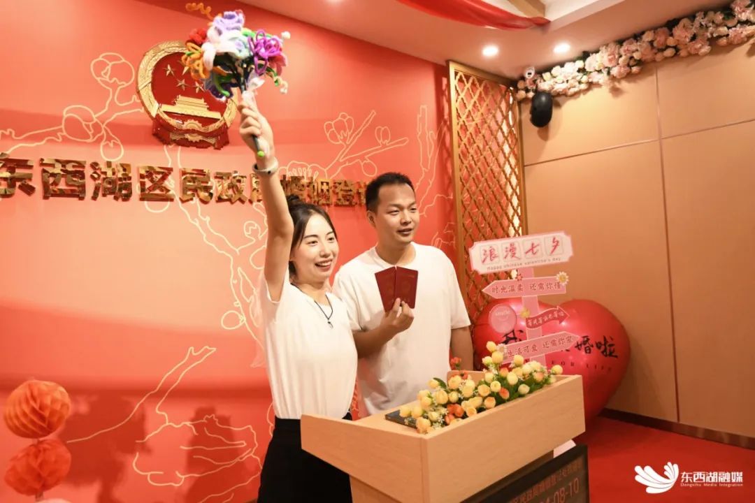 “今年七夕恰逢周六。前一天,我们特意布置了场地,做好了各项准备。”东西湖区婚姻登记处相关负责人介绍,七夕当天网上预约81对,实际上午半天已办理96对。他们增设了办证窗口,增加了辅助人员以优化服务流程、缩短等待时间。同时,还将服务时间提前了一个小时,并取消了午休时间,确保每一位新人都能顺利、愉快地完成登记手续。