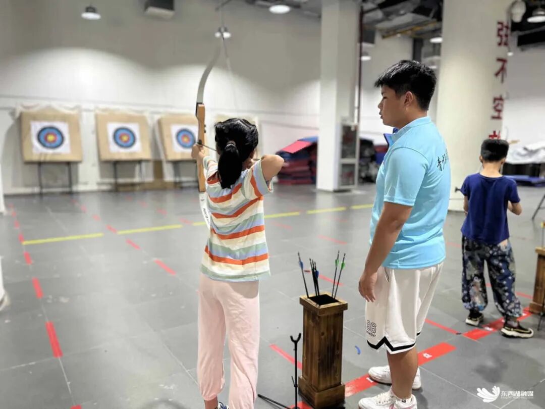 学员钟槿芮按照教练指导,一丝不苟地完成每一个射箭动作。