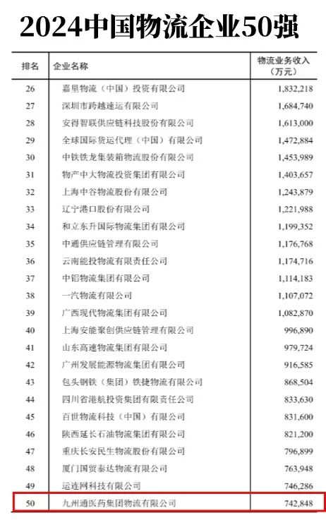 近日,中国物流与采购联合会发布2024年度中国物流企业50强、民营物流企业50强名单,东西湖企业九州通医药集团物流有限公司(以下简称“九州通物流”)入围综合物流企业50强,同时位列民营物流企业第18名,是唯一一家医药物流领域上榜企业。
