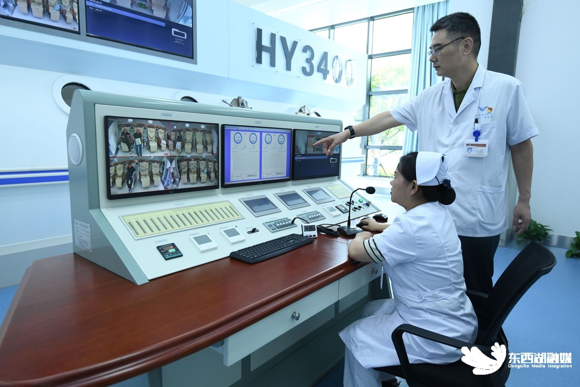 医护人员正在调整氧舱内的数值。
