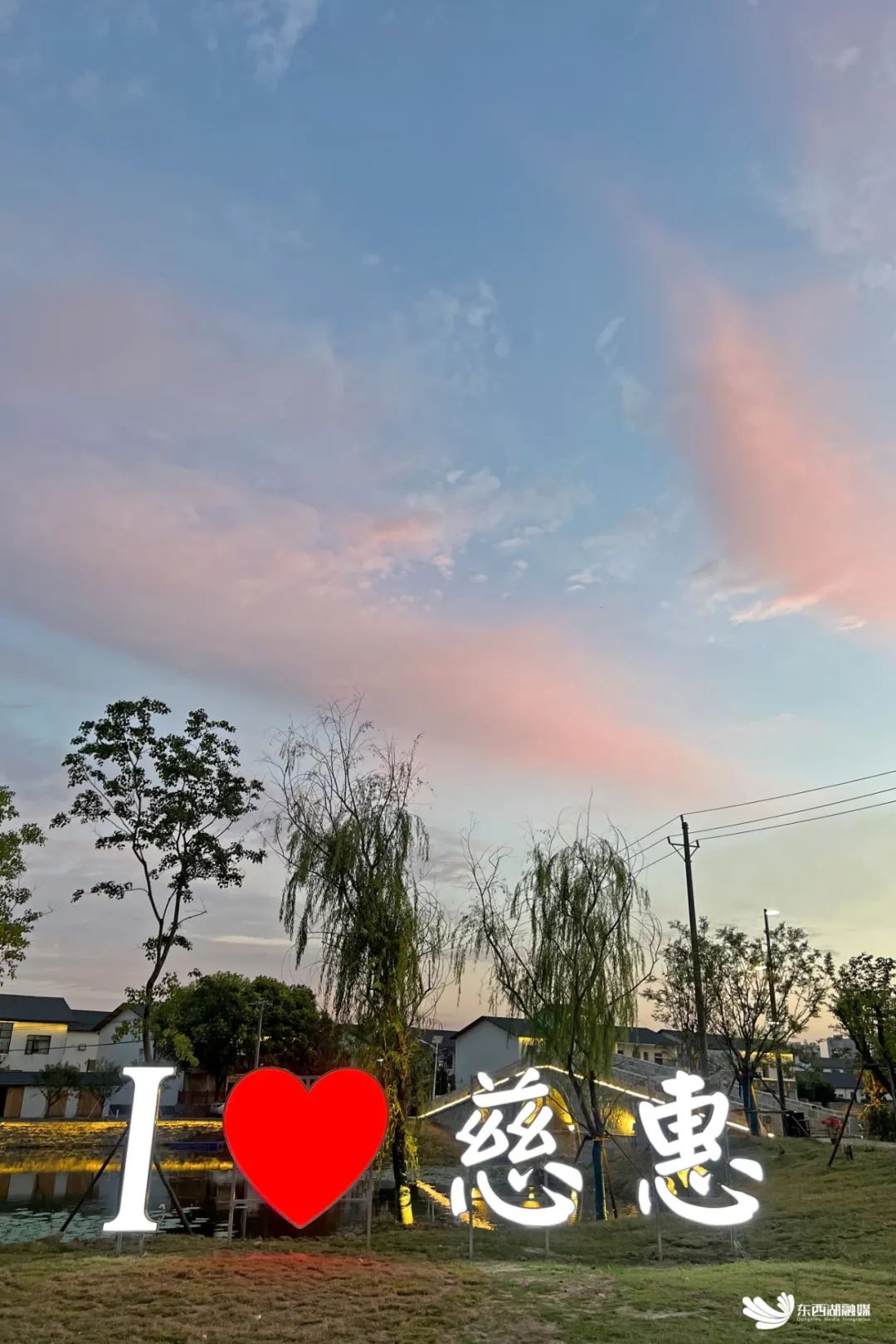 沿慈惠街往里走,靠汉江一侧村舍连片成排,沟渠池塘相连,乡间小路纵横。经过改造,村舍的院墙、立面、屋顶、门窗全部粉刷、更换一新,还有各色园林小景、雕塑凉亭点缀其间。搭配夏日限定的晚霞,怎么拍都是大片。