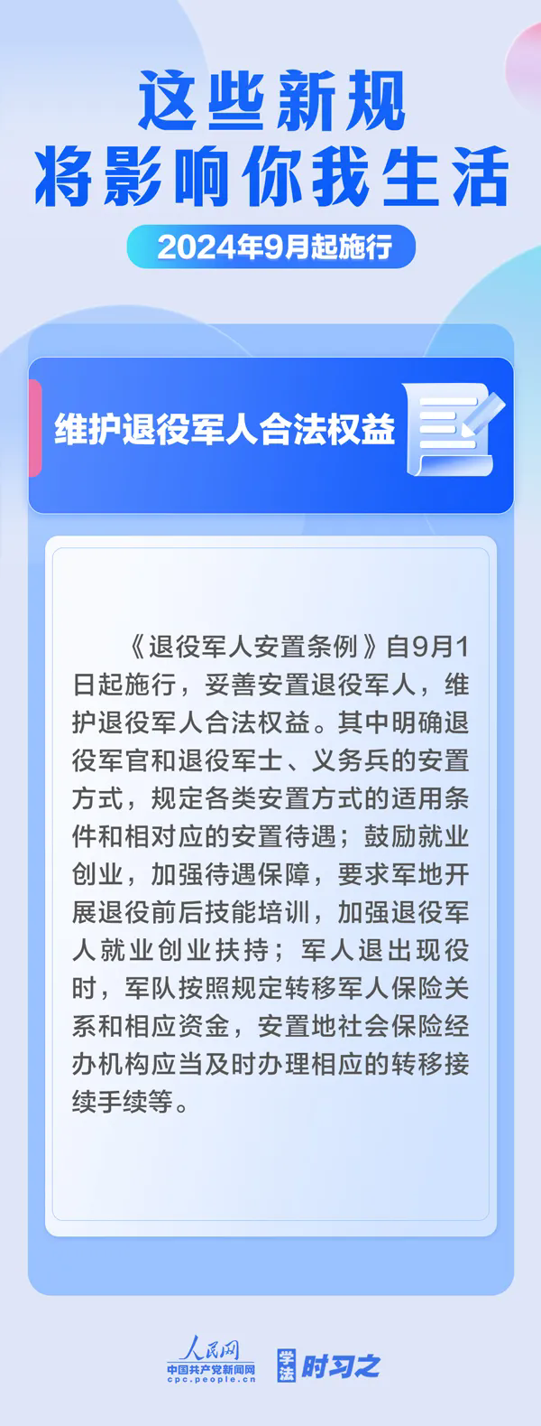 这些新规,今起实施! 2024-09-01 12:21 东西湖区融媒体中心 0 维护退役军人合法权益 规范慈善活动运行 规制线上消费中 侵害消费者权益的焦点问题 …… 9月起 这些新规施行 将影响你我生活 一起来看↓↓ 来源 - 人民网