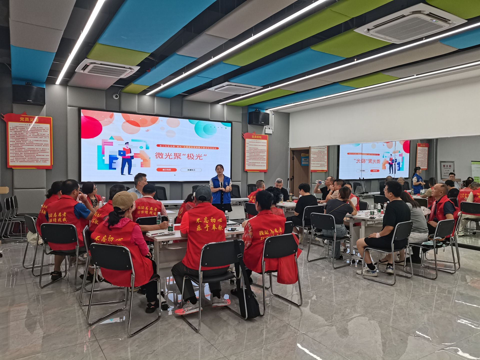 此次培训主题为“微光聚极光”,旨在通过主题向团队成员传达“众人拾柴火焰高”的道理。社工站覃老师以PPT形式,讲解团队凝聚力如何重要、每个人在团队中扮演什么角色、究竟怎么提升凝聚力等知识技能,成员们聚精会神听讲,不时与老师进行互动。