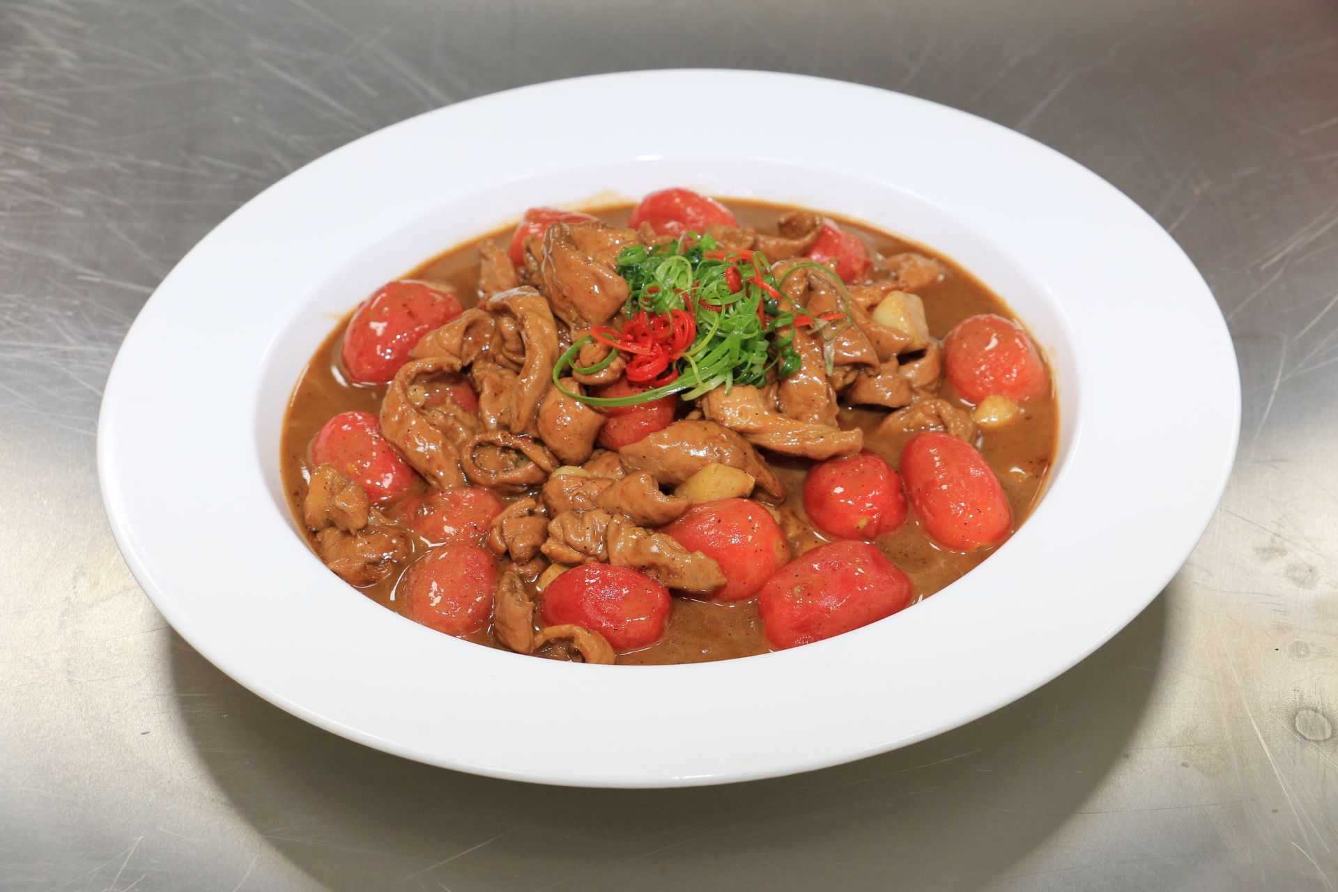 采用柏泉本地的有机小番茄,去皮后和肥肠一起烧制,口感更加地多汁、爽口。