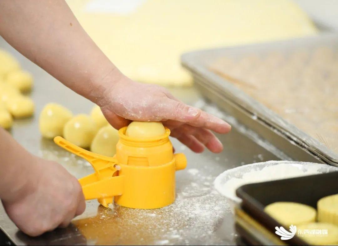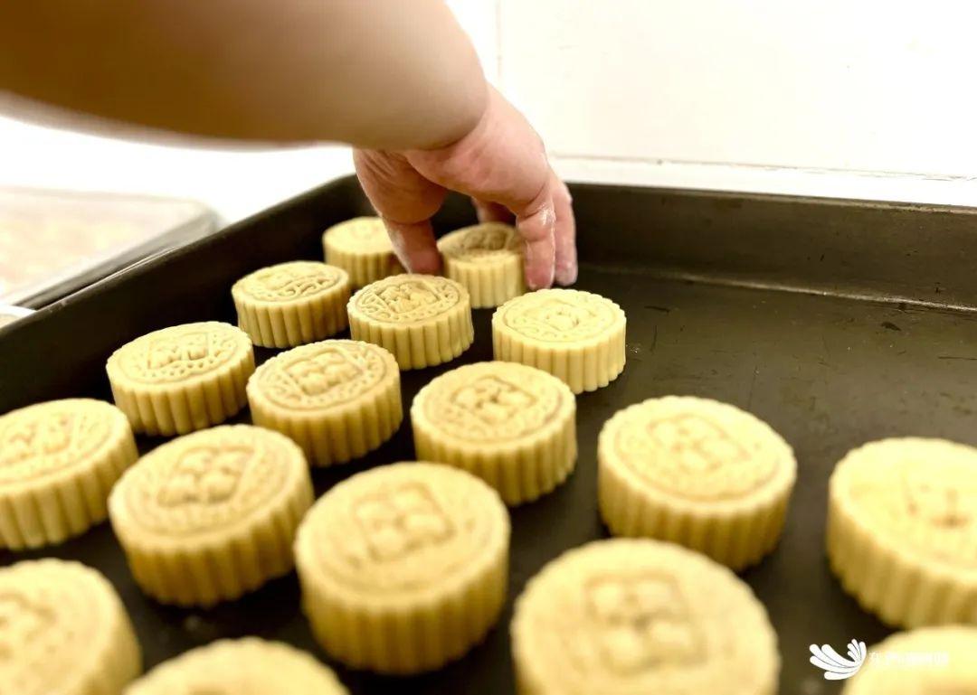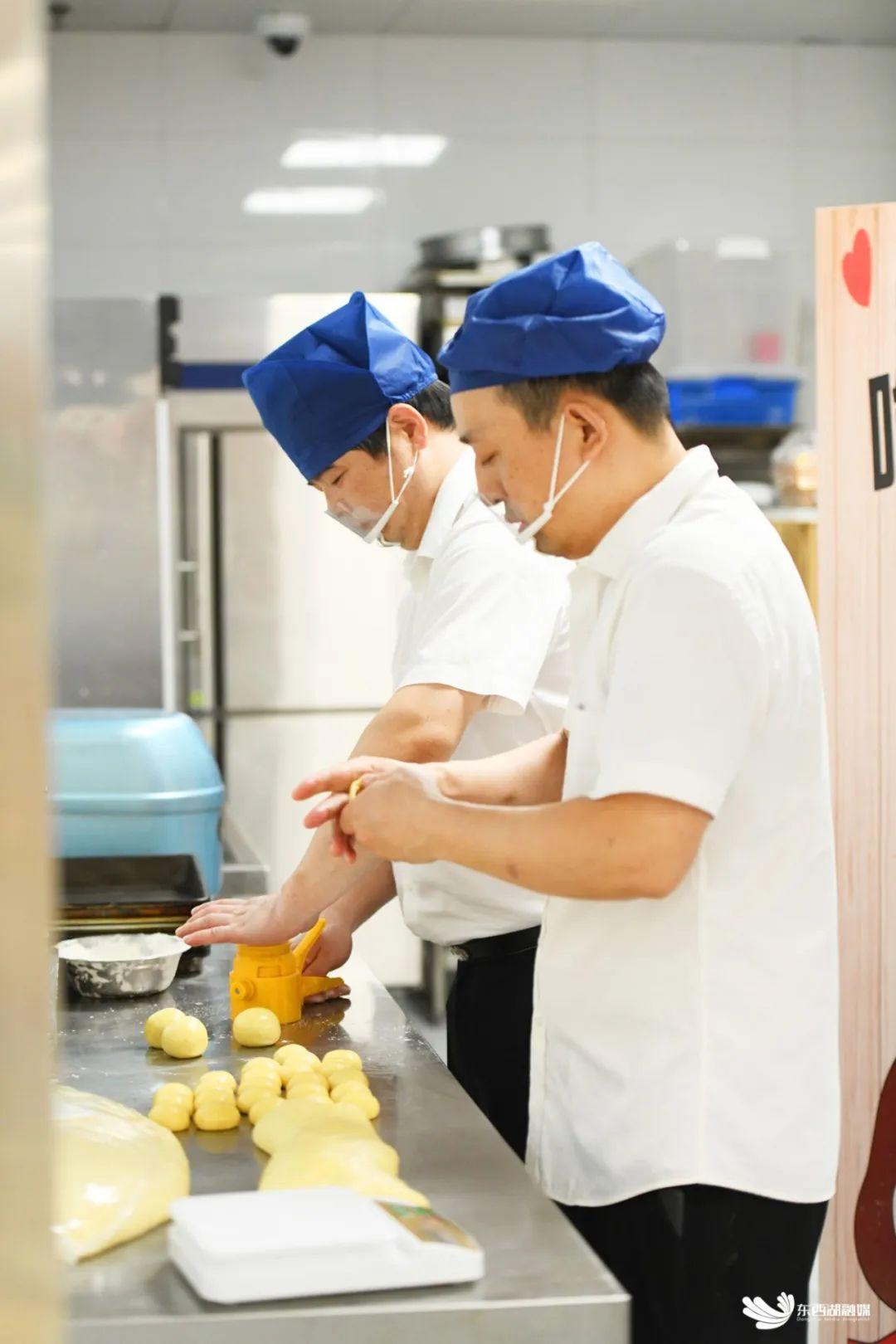 9月13日,东西湖融媒记者在协和医院金银湖院区饮食服务中心看到,厨工师傅们穿着规范,手脚麻利地制作月饼。擀面、拌馅、建模、刷蛋液、烤制……到处都是忙碌的身影,每个烤箱都在加紧运转,整个后厨弥漫着香甜的气味。
