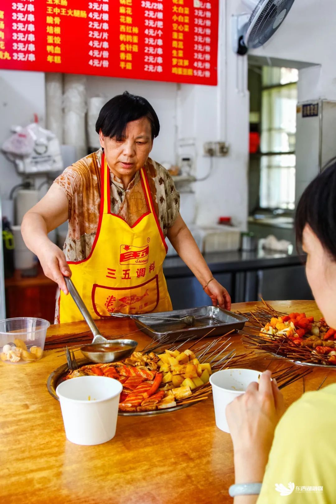 老板夫妻二人来自孝感广水,2006年开始在常青五村卖麻辣烫,到如今已经有18年了。两人分工明确,一人负责备菜,一人负责备料。