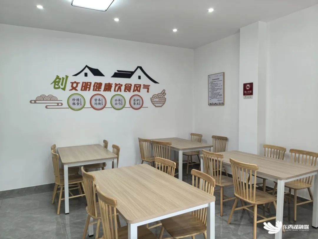共享食堂内部装修简洁,桌椅摆放整齐。