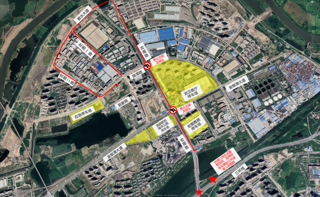 武汉极地海洋世界位于宏图路金银潭大道西南角,设置东、北2个进出口,分别位于宏图路、金银潭大道。预计国庆节期间日均客流1.5万余人次,峰值日均3万人次、车辆6000余台;武汉梧桐雨预计接待游客2万人,日均2500人次,车辆500余台次。