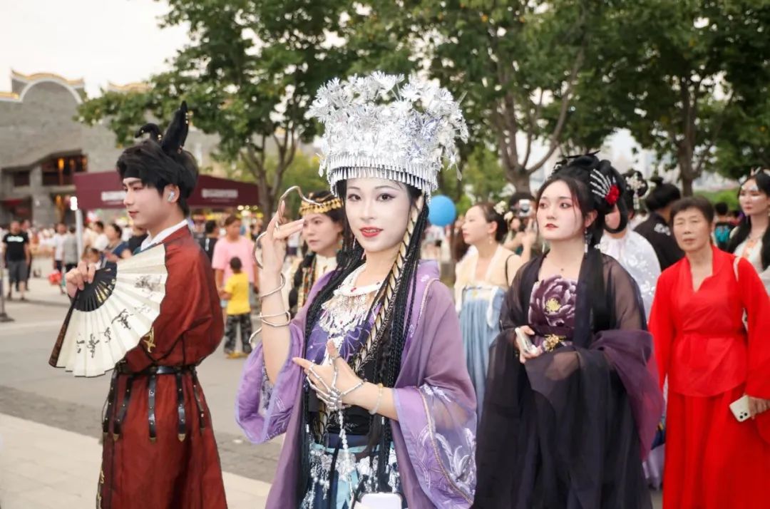 谁说中式美学只有一种?在这里,你不必穿越山海,就可以看到从五湖四海奔赴而来的民族服饰盛宴,一天两场盛装走秀带你领略多元的中式魅力。裙裾轻扬,身着华美民族服饰的演艺人员沿东门—汉口里—东内舞台的路线巡游走秀,游客还有机会和颜值KOL亲密互动合影,360度沉浸式感受“花影缤纷舞霓裳”的视觉盛宴。