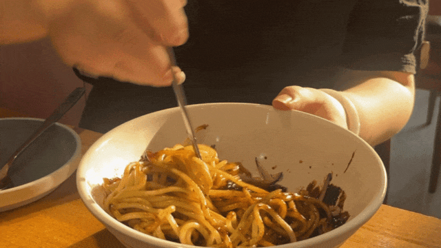 韩剧同款炸酱面是店里的招牌,酱料选用三瘦七肥的五花肉、洋葱、圆白菜、大葱,配上韩国原产的春酱和白砂糖煸炒熬制,淋在现揉的面条上,一口下去,脂肪的香气与酱料交融,油润中带着香甜。