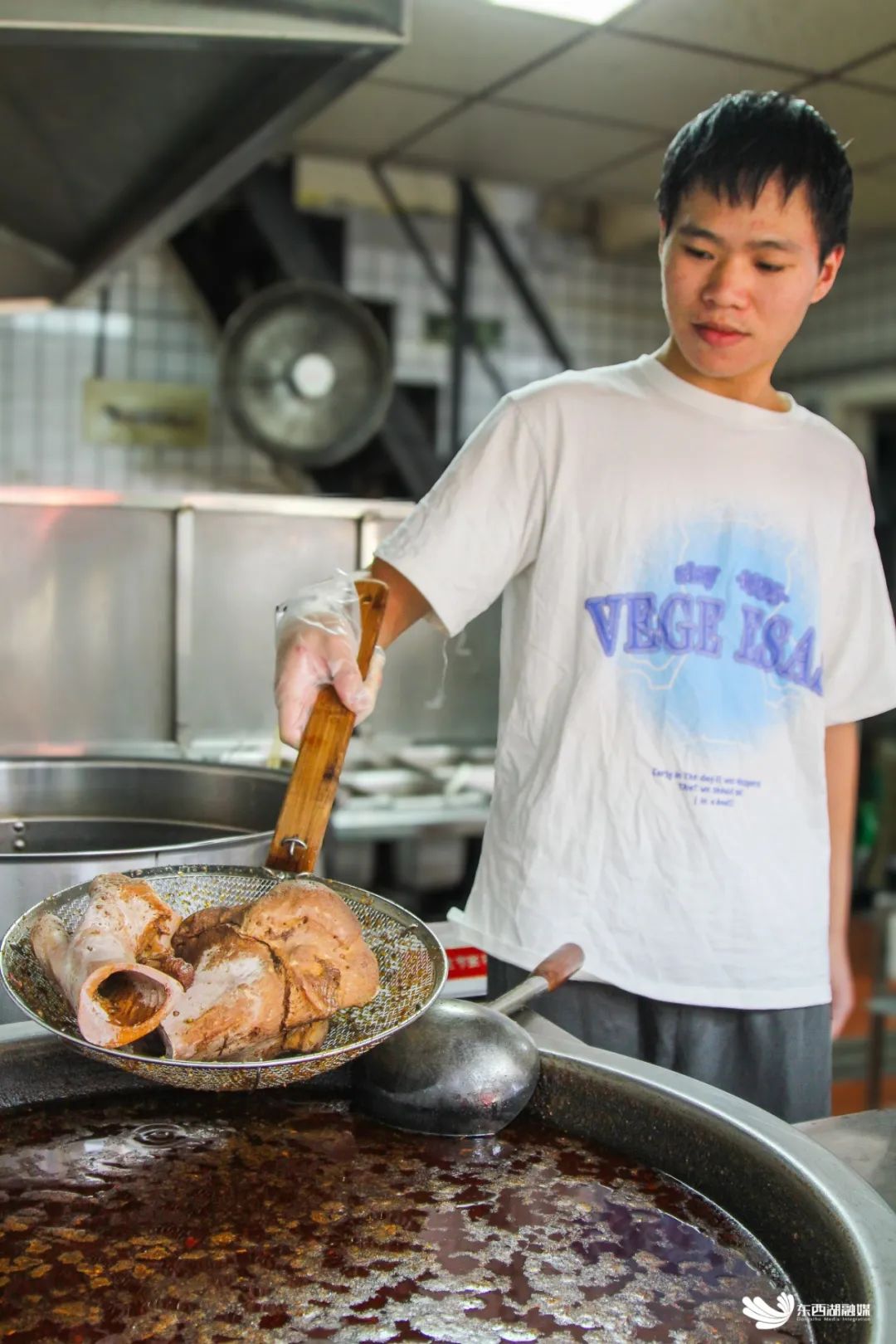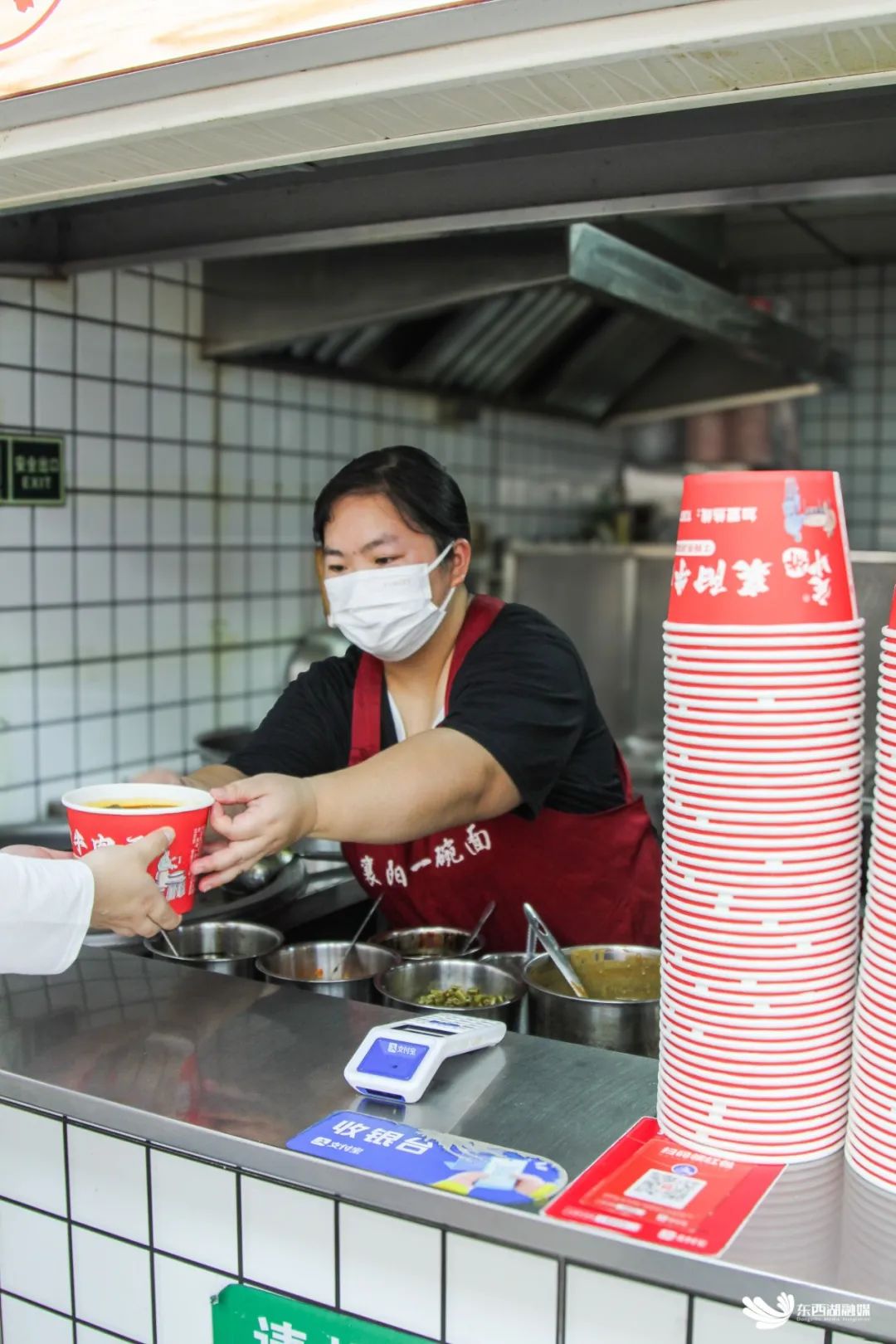 “我要一碗牛肉面在店里吃,再来一碗海带面打包带走……”顾客点单声里,老板有条不紊地烫着面条。