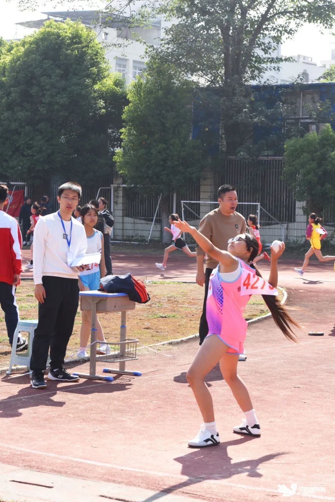 赛场一角,高中组运动员李诗涯正在教练的指导下进行最后的热身。“我以前在初中田径队时,铅球用的都是3公斤的,今年进入高中后,使用的铅球变成了4公斤,明显感觉自己的力量训练还有待加强。”面对新的挑战,李诗涯没有退缩。“教练耐心地教我如何更好地发力、如何调整姿势,这让我受益匪浅。”李诗涯说。