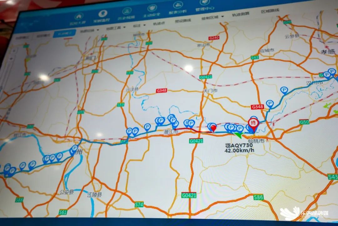 在愚公物流车队的调度指挥中心,映入记者眼帘的是一面巨大的显示屏。一屏统揽所有在外运行车辆的实时状态。工作人员戈楚豪现场演示了从武汉至荆州的行车管控,屏幕上,绿色箭头流畅地勾勒出行进路线,每当车辆暂停,则有蓝色圆点精准标识。