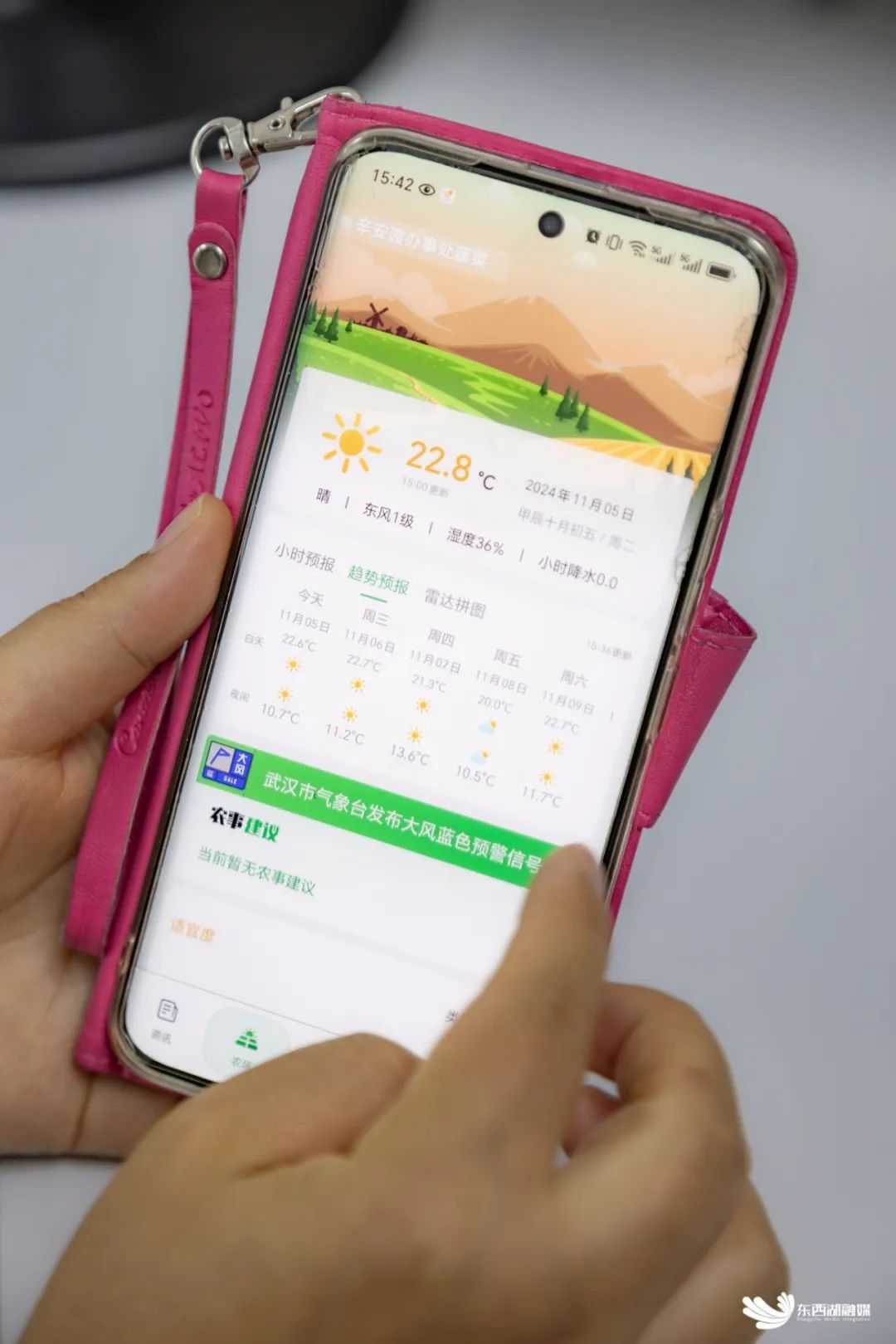 “东西湖区气象预报服务业务一体化平台于近期升级改造完工,这是平台嵌入的武汉市智慧气象服务系统(农业),页面上的数据主要服务于农业管理部门,作为决策参考。”东西湖区气象局副局长黄永学介绍,数据来源于在涉农街道搭建的11个小气候监测站,当出现农业气象灾害预警情况时,数据能精确到区域和强度。同时,这些信息通过省气象局搭建的“天惠农”APP直达农户手机里。