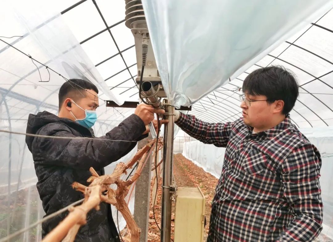 在葡萄大棚安装葡萄小气候监测站。通讯员供图