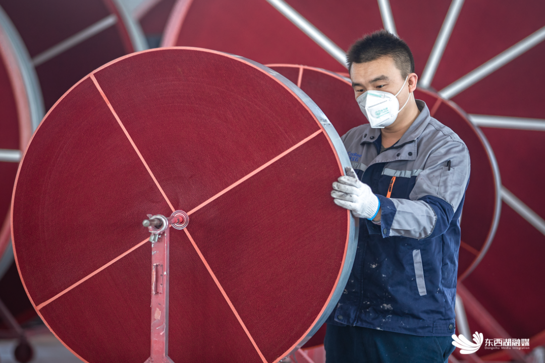 投用不久的总装车间,技术员正在检查即将组装的除湿转轮,在他身后,大尺寸除湿转轮直径超过2米。