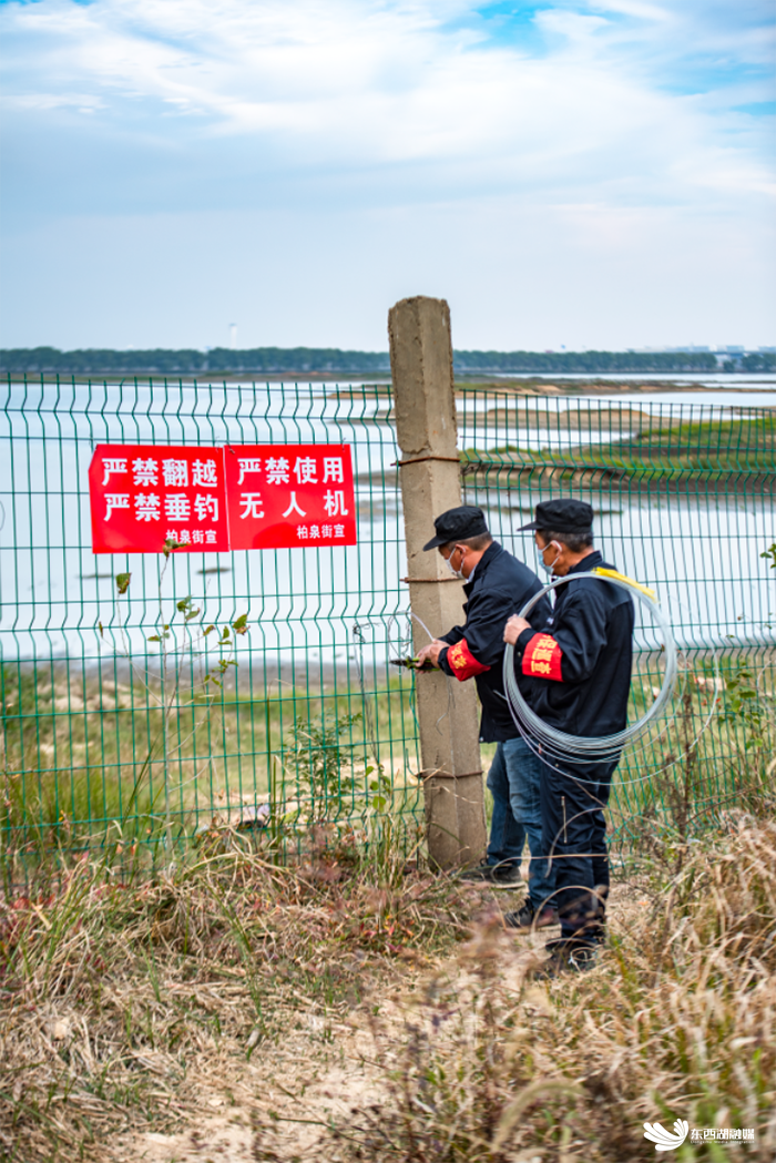 巡护时需要查看围网,修补围栏,排查可能伤害鸟类的各种隐患,向前来观鸟的市民宣传候鸟保护常识,劝导文明观鸟,沿途捡拾垃圾。不仅如此,还要随身携带望远镜,时刻观察湖面候鸟的情况。“如果有病伤鸟,要及时上报进行救助。”魏志刚说道。