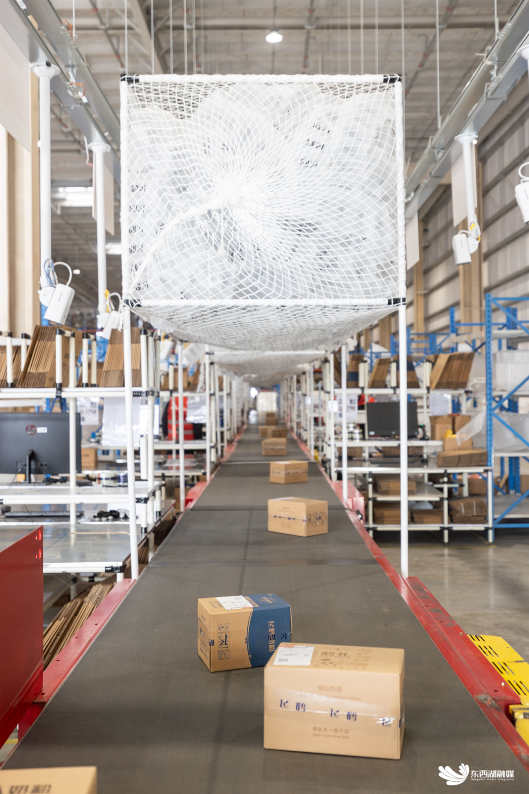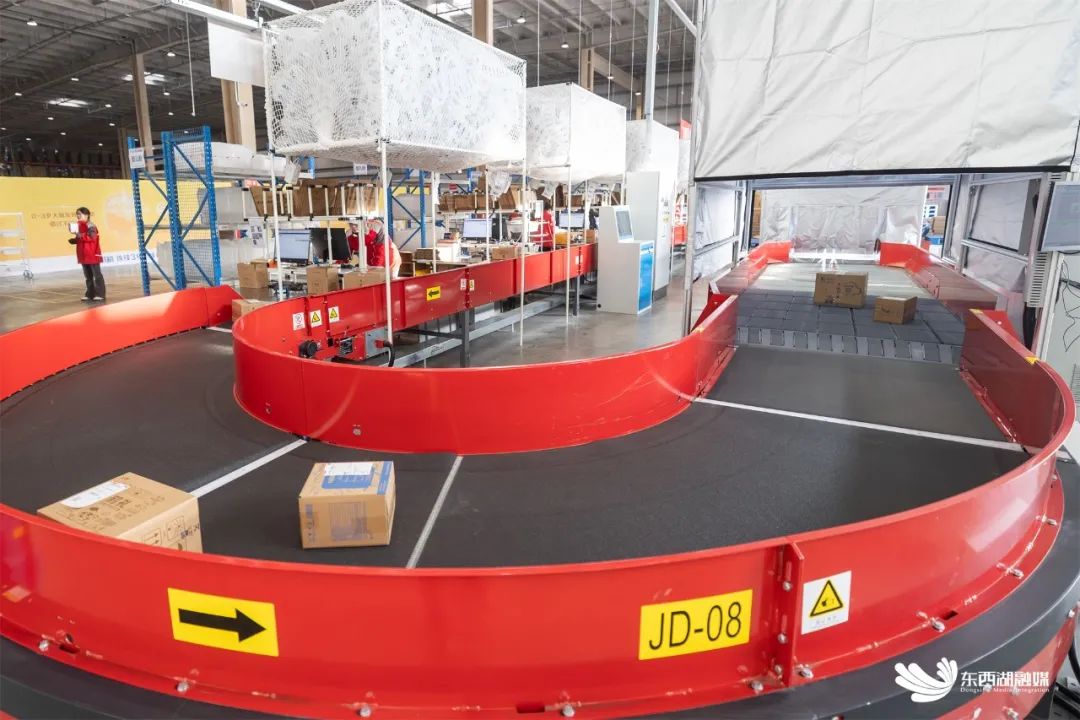 90米长的自动称重分拣DWS设备,每小时可分拣4500个包裹,极大提升了分拣效率。