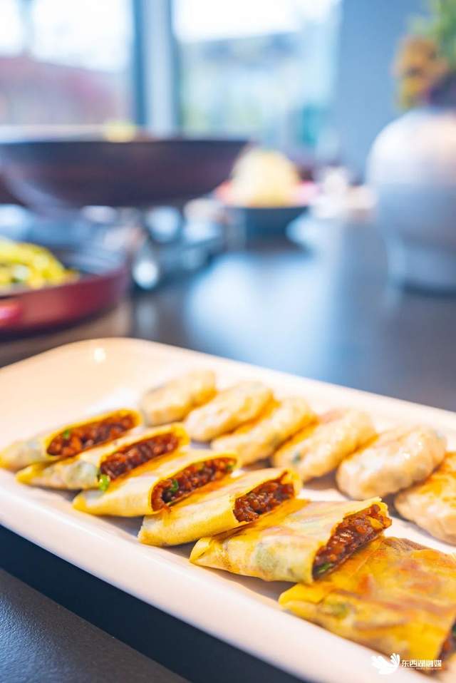 除了这些硬菜,手工面点也同样出彩。“煎饼双拼”,手工擀制的薄面皮,韧劲十足,鲜美的豆腐馅,调味恰到好处,轻咬一口,豆香四溢。粉丝馅的同样美味,粉丝被汤汁精心浸润,咸香酥脆。从馅料到和面,再到煎烤,全程手工现做,口口都是纯粹美味。