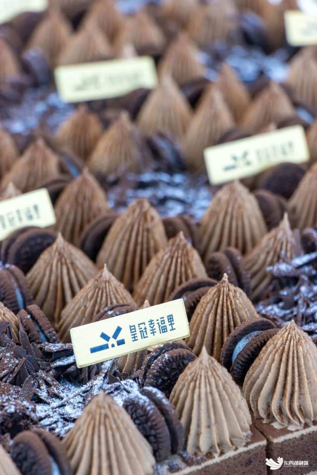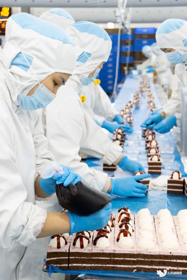 在蛋糕包装车间,同样是一片忙碌景象,瑞士卷、海苔松小贝、黑森林、提拉米苏等经典蛋糕、爆款蛋糕正在裱花装饰。