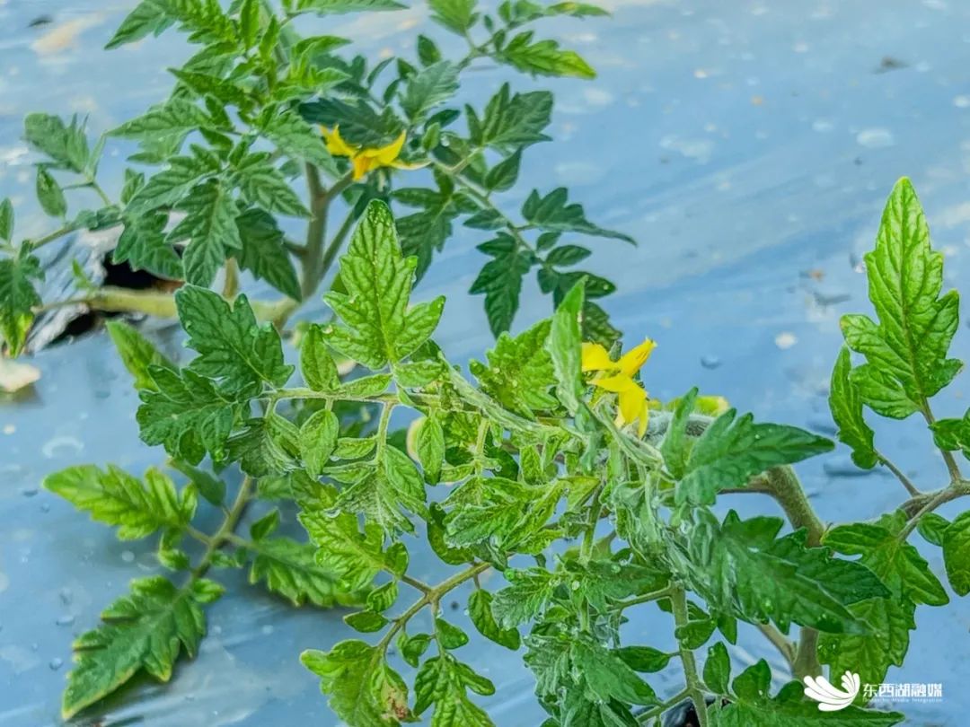在钢架大棚外,工作人员正在对保温膜进行加厚、加固。棚内,番茄秧苗长势正好,已经结出花朵。