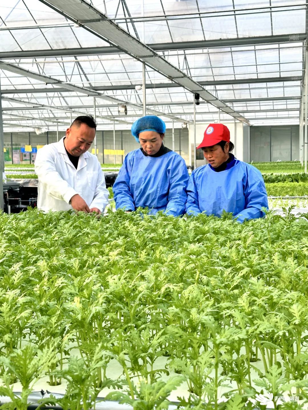在空港湿地花田植物工厂工作的张慧萍(中)。