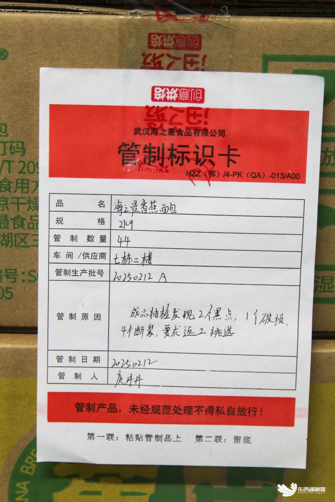 在香蕉面包生产车间,记者注意到一个运输托盘上40多箱产品被贴上了“管制标识卡”,卡片上写着:“成品抽检发现2个黑点、1个破损、4个断裂,要求返工挑选。”
