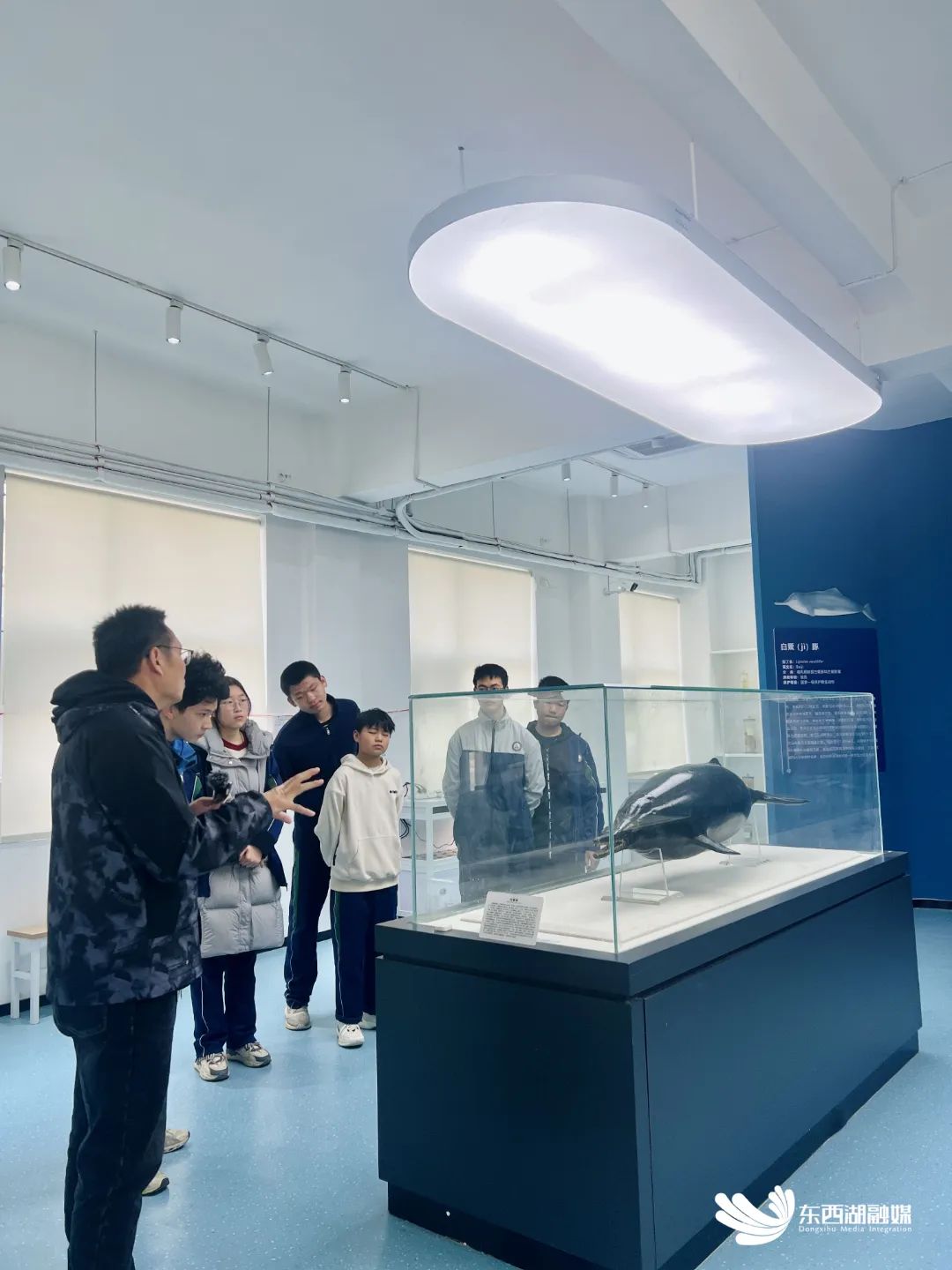生态馆内,中华鲟、胭脂鱼、白鱀豚等珍稀水生动物标本栩栩如生,近九十件动物标本让人目不暇接。学生们化身为小小探险家,穿梭于各个角落,聆听珍稀野生动物的保护故事,接受生物多样性的教育。