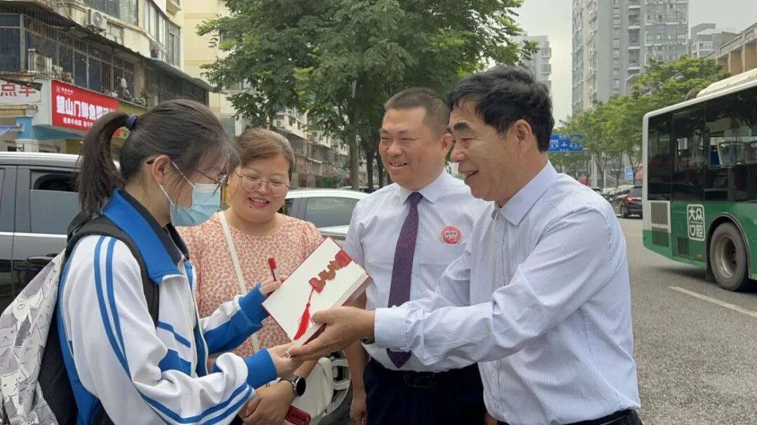 爱心送考持续20年不间断的邢刘宝,为考生送上标有金榜题名的笔记本。