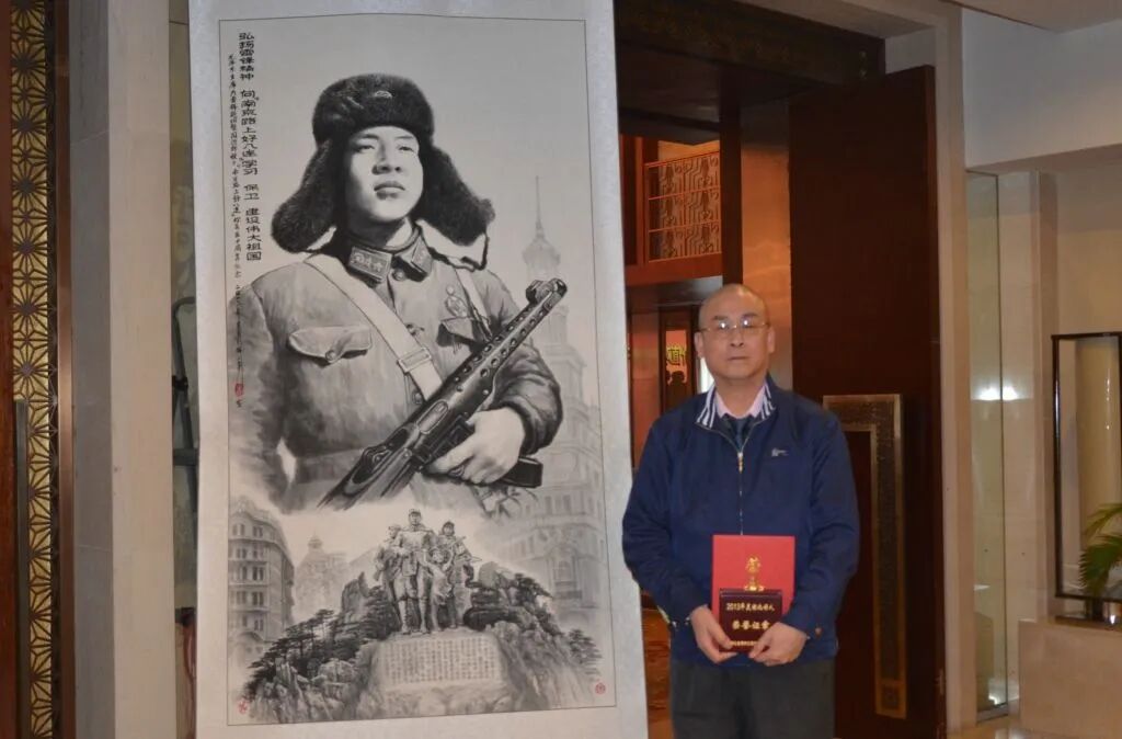 荣获2013年度“湖北好人”的的哥张国贤与雷锋像合影。