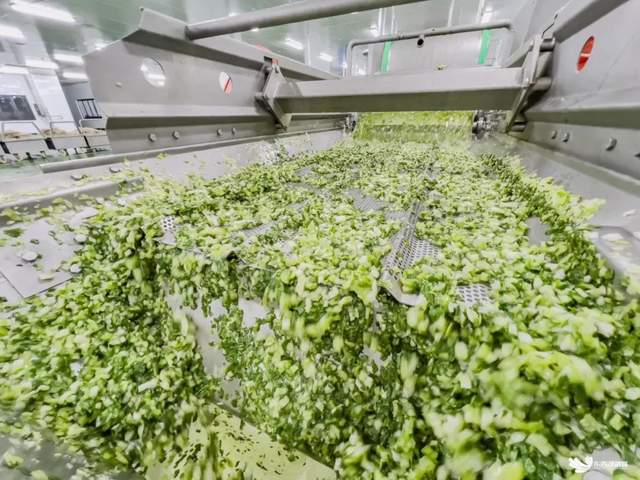 首要秘诀是“快”。上海青原料从进厂到变成颗粒净菜,仅需10分钟。每天早上5点,上海青准时从田间送达巴比净菜车间,完成人工初拣后,在长约60米的流水线上经历切制、浸泡清洗、鼓泡黏毛清洗、高温漂烫、常温水冷却、冰水两次冷却等12道工序,人工操作与智能化设备无缝衔接。