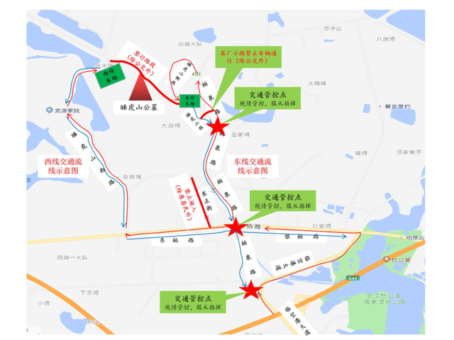 1.睡虎山路、睡虎山侧路实行由北向南单向通行,禁止车辆由南向北通行(除持证外);柏泉路睡虎山路口(原睡虎山三叉路口)实行管制,前往睡虎山陵园的机动车一律由柏泉路、睡虎山侧路进入。