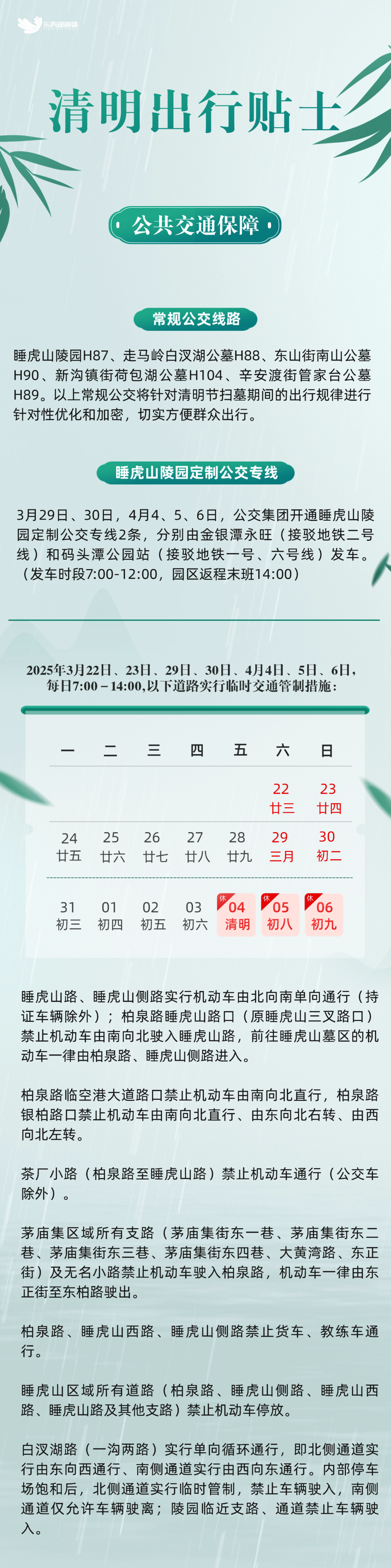 ①不便来园祭祀的市民朋友,可关注园区官方公众号:武汉睡虎山人文纪念公园有限公司,选择通过网上祭祀的形式,在线寄托哀思,也可选择“代客祭扫”服务,让您的每一份思念和祝福都能如期送达。咨询电话:027--83234100。