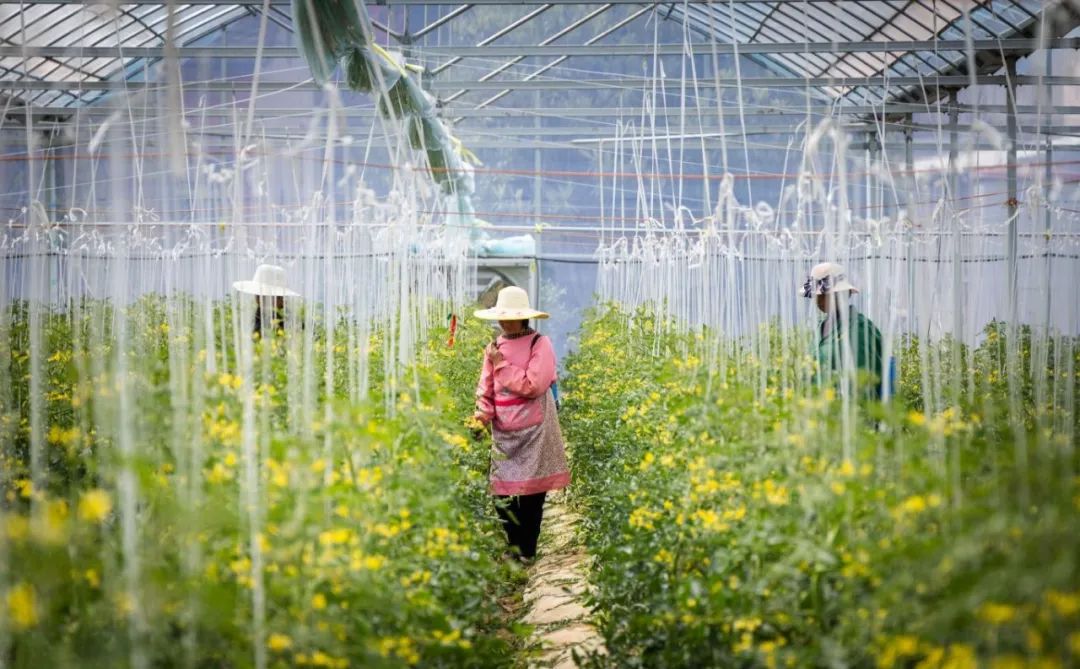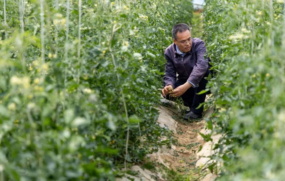 大棚里,一排排小番茄的藤蔓被尼龙绳吊起后挂到钢架上。王建兵介绍,这是一款名为“柏泉番茄”的品种,因皮嫩多汁、口感酸甜而闻名,已入列“江城百臻”名录。每株藤蔓可长到2米高,从上到下结出10穗,一穗能结出30颗红玛瑙大小的果子,“一株能结出十斤左右,一亩一季可产1万斤小番茄,高产且品质出众。”