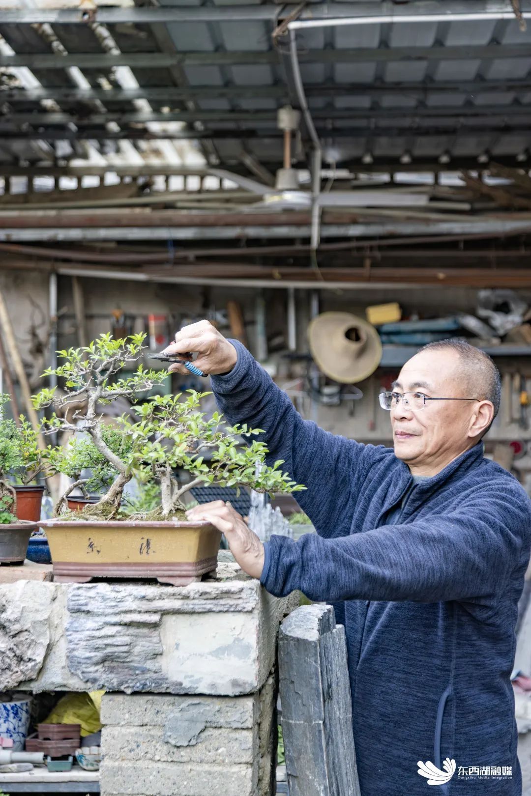 段国兵修建盆栽造型。