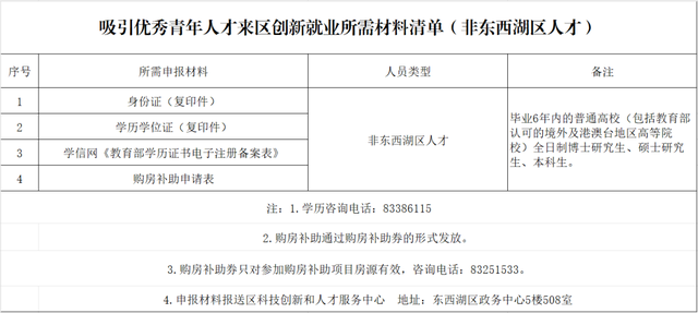 来区就业创业的毕业6年内的普通高校(包括教育部认可的境外及港澳台地区高等院校)全日制博士研究生、硕士研究生、本科生,在我区购买新建商品房住宅的,分别给予10万元、8万元、5万元购房补助。
