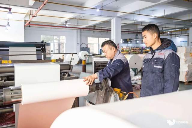 记者走进鑫东升生产车间,工人们忙碌而有序,自动化生产线开足马力,高速运转的淋膜机将一张张食品级原纸和热熔PE膜压合在一起,形成比传统塑料更安全环保的食品包装淋膜纸。