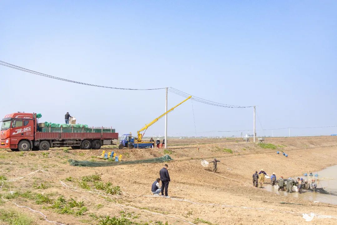 国家万亩渔业绿色循环试点基地鲜鱼起网现场。