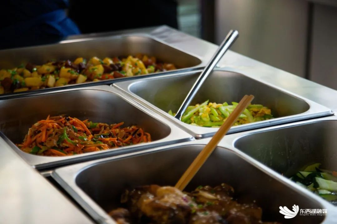 记者在现场看到,近400平方米的食堂已座无虚席。明档操作间里,穿戴整齐的厨师正忙着炒菜。一旁的展板写着当日菜单:土豆红烧肉、炸鸡腿、鱼香肉丝、冬瓜蒸虾米......荤素搭配,一荤两素只要12元。