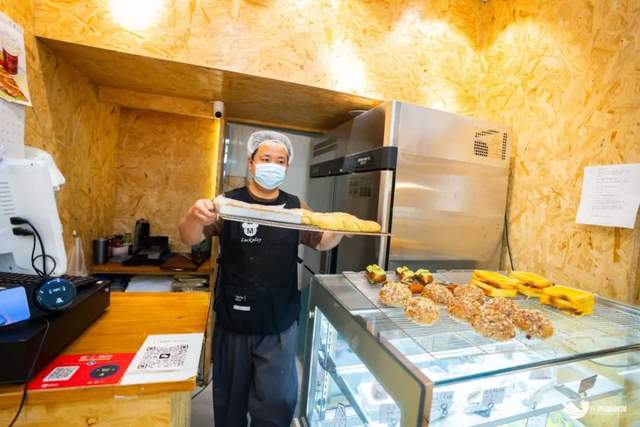 2019年,他和妻子在常青花园开设了自己的烘焙店。目前,店内提供50多种面包,一排排圆润饱满的日式面包泛着淡金色光泽,其中最受欢迎的招牌产品包括开心果碱水和红豆黄油碱水,会员价从4.5元到20元不等。