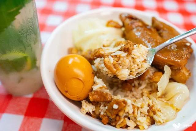 钟情胶原蛋白的食客,会点上一份台湾猪脚饭。炖煮到极致的猪脚软糯弹牙,筷子轻轻一碰就能骨肉分离。颤巍巍的皮肉挂着浓稠的卤汁,入口是满满的胶质感,搭配的酸甜萝卜干正好化解油腻。