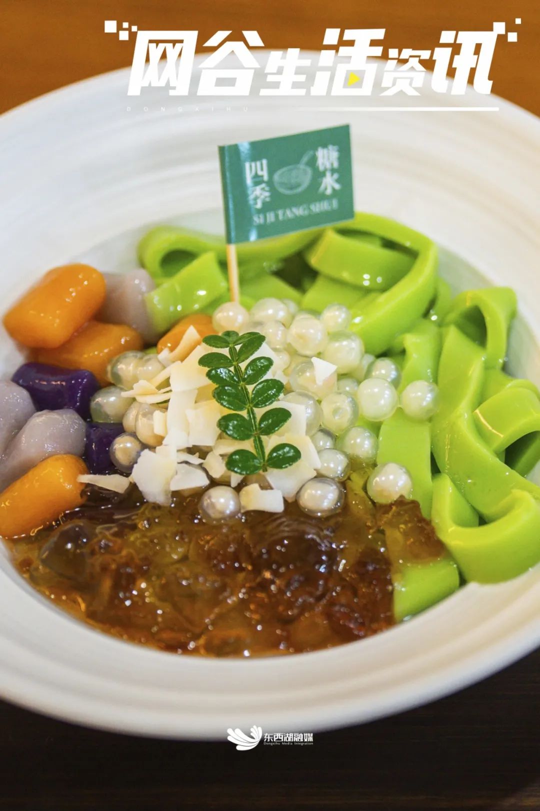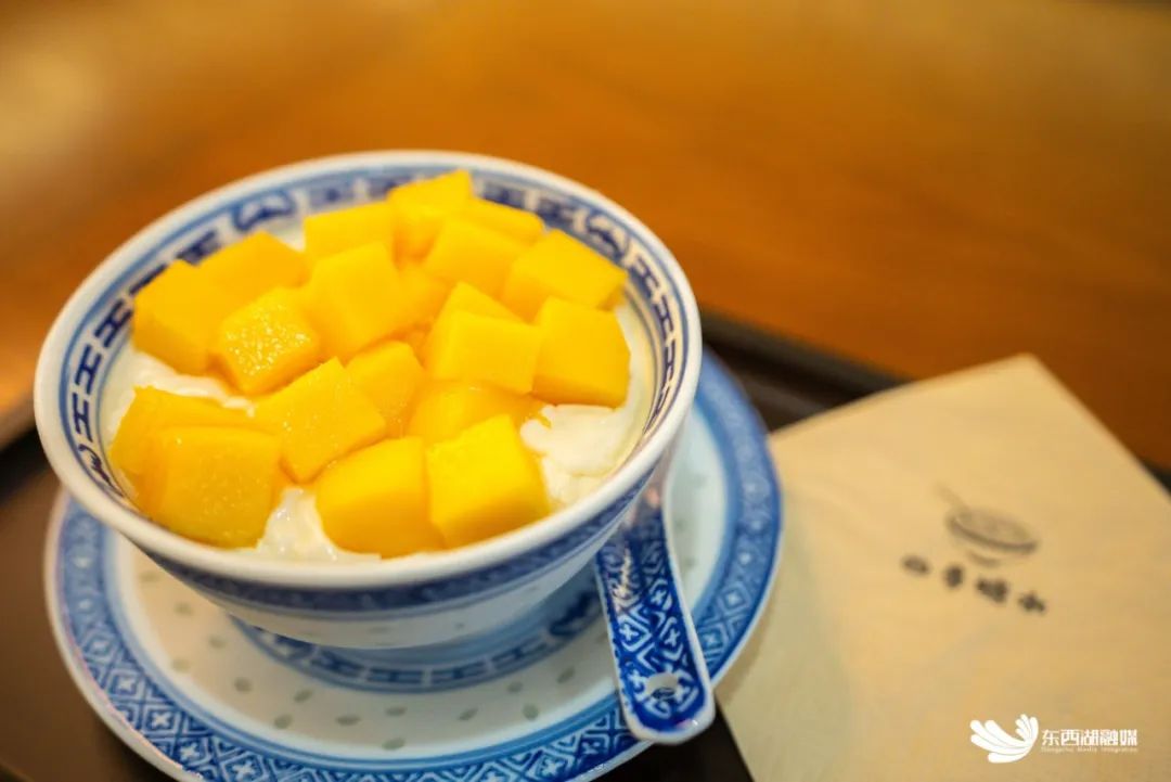 开业不到两个月,杨枝甘露绵绵冰、芋圆双芋奶冻、四季大满贯、爆爆珠芋圆斑斓河粉就成为店里的招牌。每一份糖水不仅摆盘好看,料也很足。芒果的酸甜与椰香绵绵冰的碰撞,成为夏日解暑神器。芋头制成的绵密芋泥,搭配手工芋圆,双重口感。爆爆珠芋圆斑斓河粉名字里的“河粉”为斑斓汁制成的绿色粉条,滑嫩爽口,与爆爆珠、芋圆、椰奶形成四重Q弹,每一勺都是惊喜。