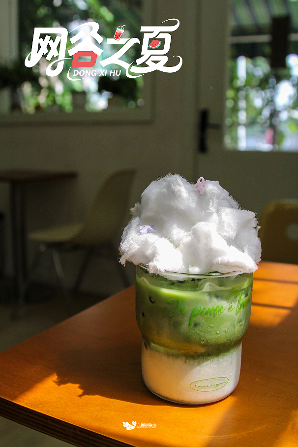 下午三点,灿烂的阳光透过街边的大树,从旧式的白色木框窗户照进来,光斑停在云朵棉花糖上,音响里播放着淡淡的歌。猛吸一口云朵下的抹茶牛奶——哇,凉爽!