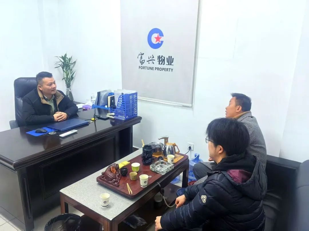 社区工作人员(图右)走访辖区物业公司。(社区供图)