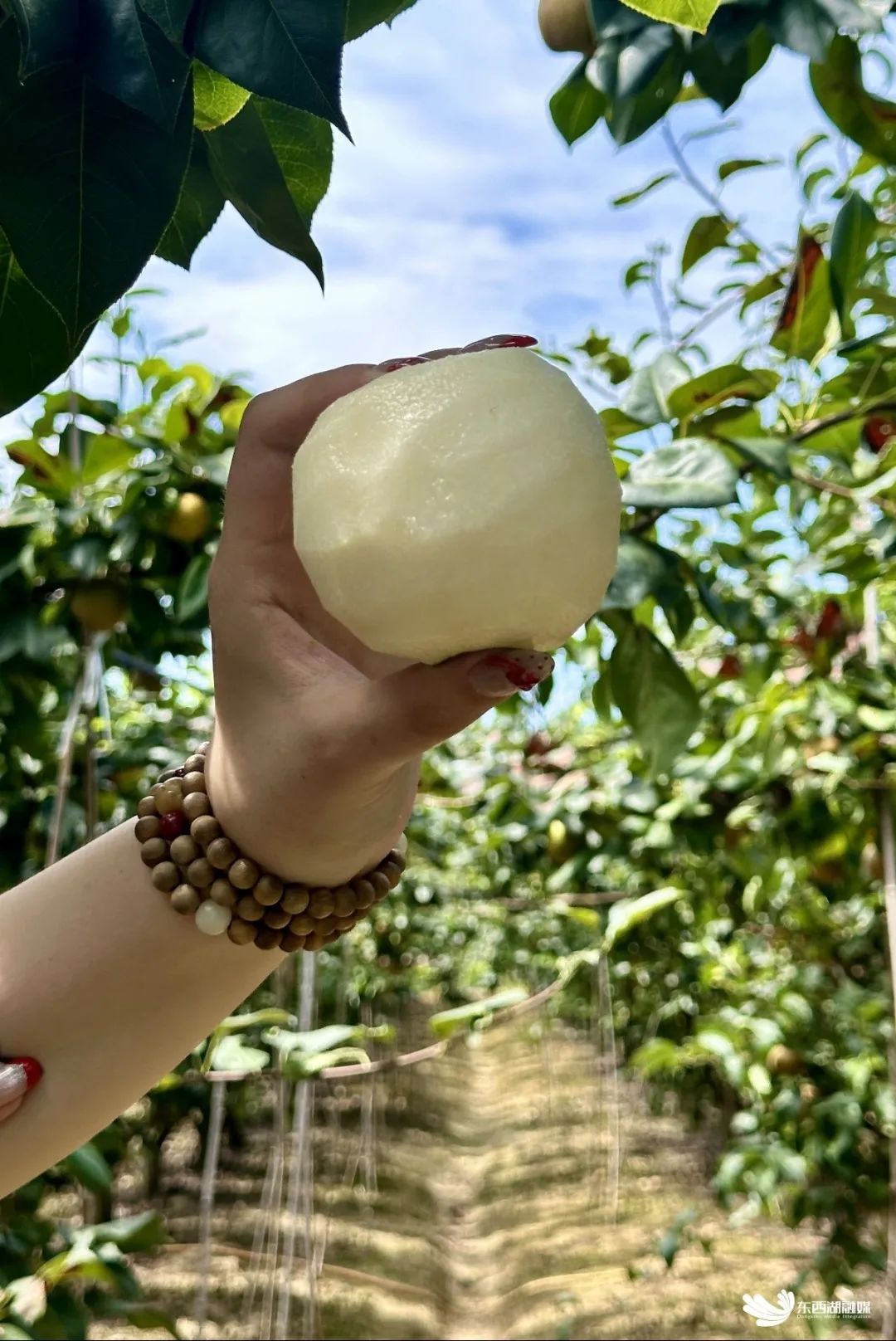 随手摘下一颗翠冠梨,果皮细薄光滑,轻轻一削,雪白的果肉便露了出来。咬上一口,“咔嚓”一声,汁水瞬间迸发,清甜中带着微微的果酸,细腻无渣。与普通梨子相比,翠冠梨的甜度更高,汁水更足,却丝毫不腻,吃完后喉咙清爽滋润,连呼吸都带着淡淡的梨香。无论是直接鲜食,还是榨汁都是消暑的绝佳选择。