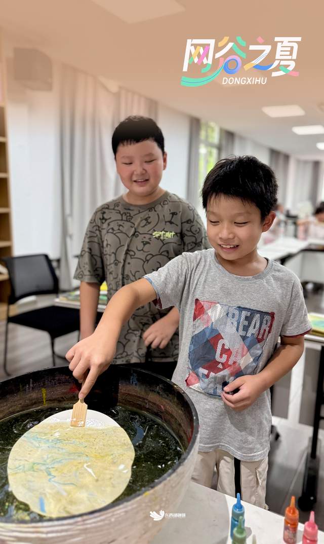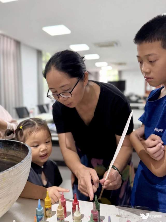 在漆扇制作区,非遗老师演示的“水中作画”技法让孩子们屏息凝神。