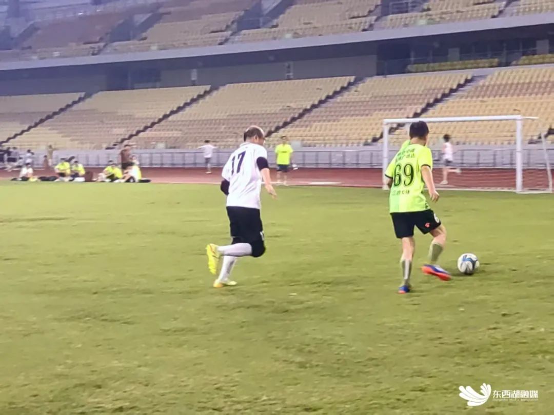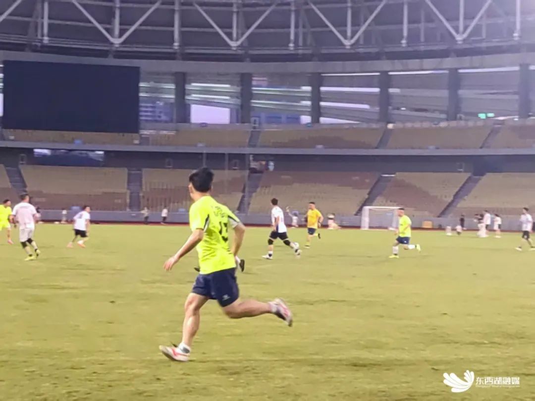 露天场地上,塑胶跑道上跑者们步履生风,与节奏铿锵的户外运动协会暴走团方阵擦肩而过,各自挥洒汗水。紧邻的绿茵场灯光如昼,一场业余足球对抗赛激战正酣。球员们奋力奔跑、精准传球,临门一脚引得场边观众齐声惊呼。“这草皮跑起来脚感一流!晚风里踢一场,痛快!”一位刚下场的球员擦着汗喊道。